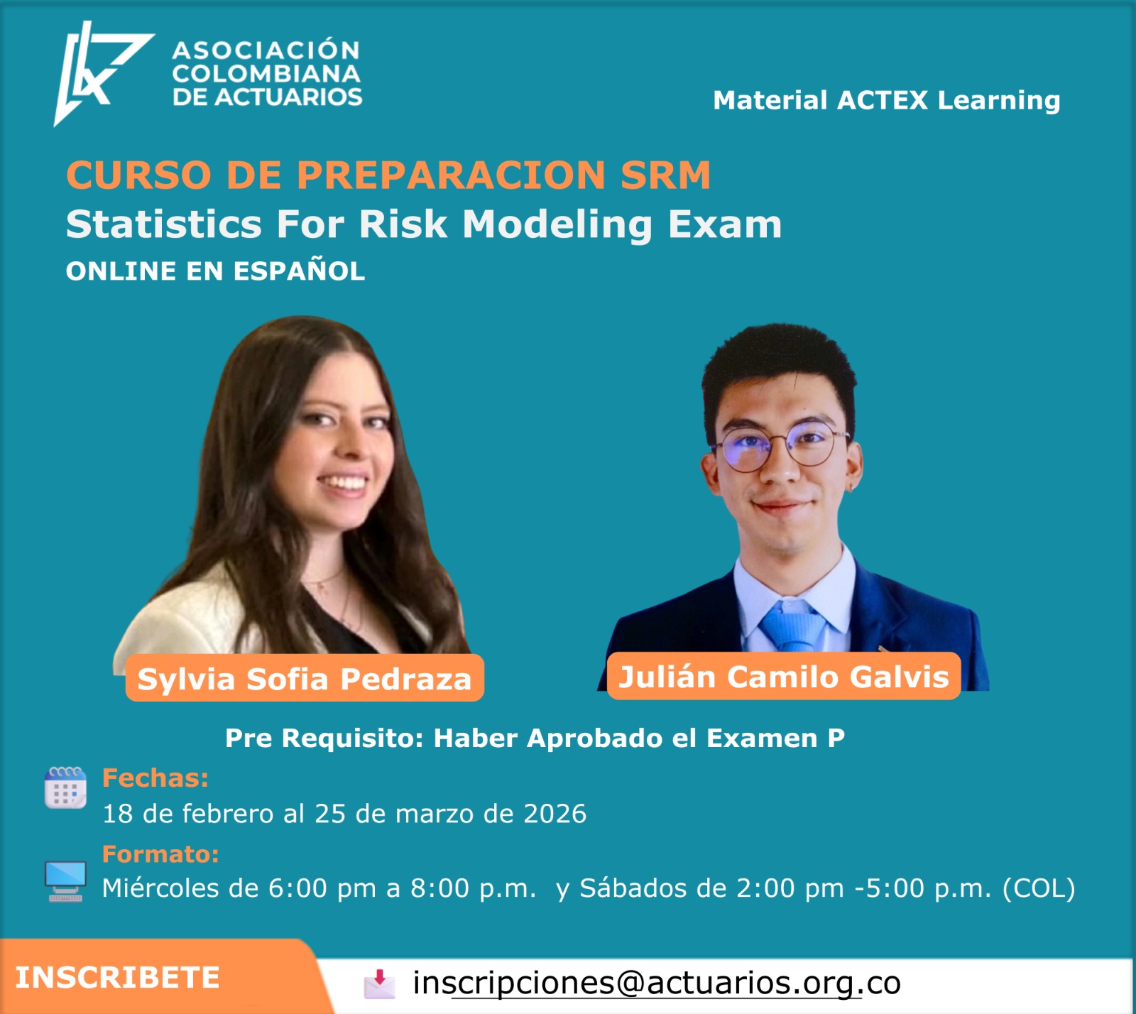 La Asociación Colombiana de Actuarios invita a su Curso de Preparación para el Examen SRM (Statistics for Risk Modeling), diseñado idealmente para aprobar el examen en mayo o septiembre de 2026.